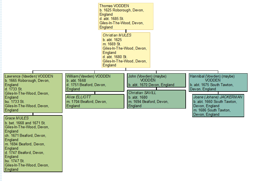 Thomas Vodden and Christian Mules lived nearly 400 years ago but they appear to be the root of the Vodden (Vawden) family tree. They are the furthest back we can definitively trace the family, and it appears that every Vodden (Vawden) can be traced back to this one couple.